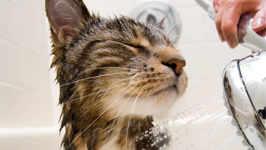 When it comes to bathing, use warm water and specially made cat shampoo, as human shampoo can dry out their skin. Wet your cat from the shoulders down, lather up the shampoo, and rinse thoroughly.